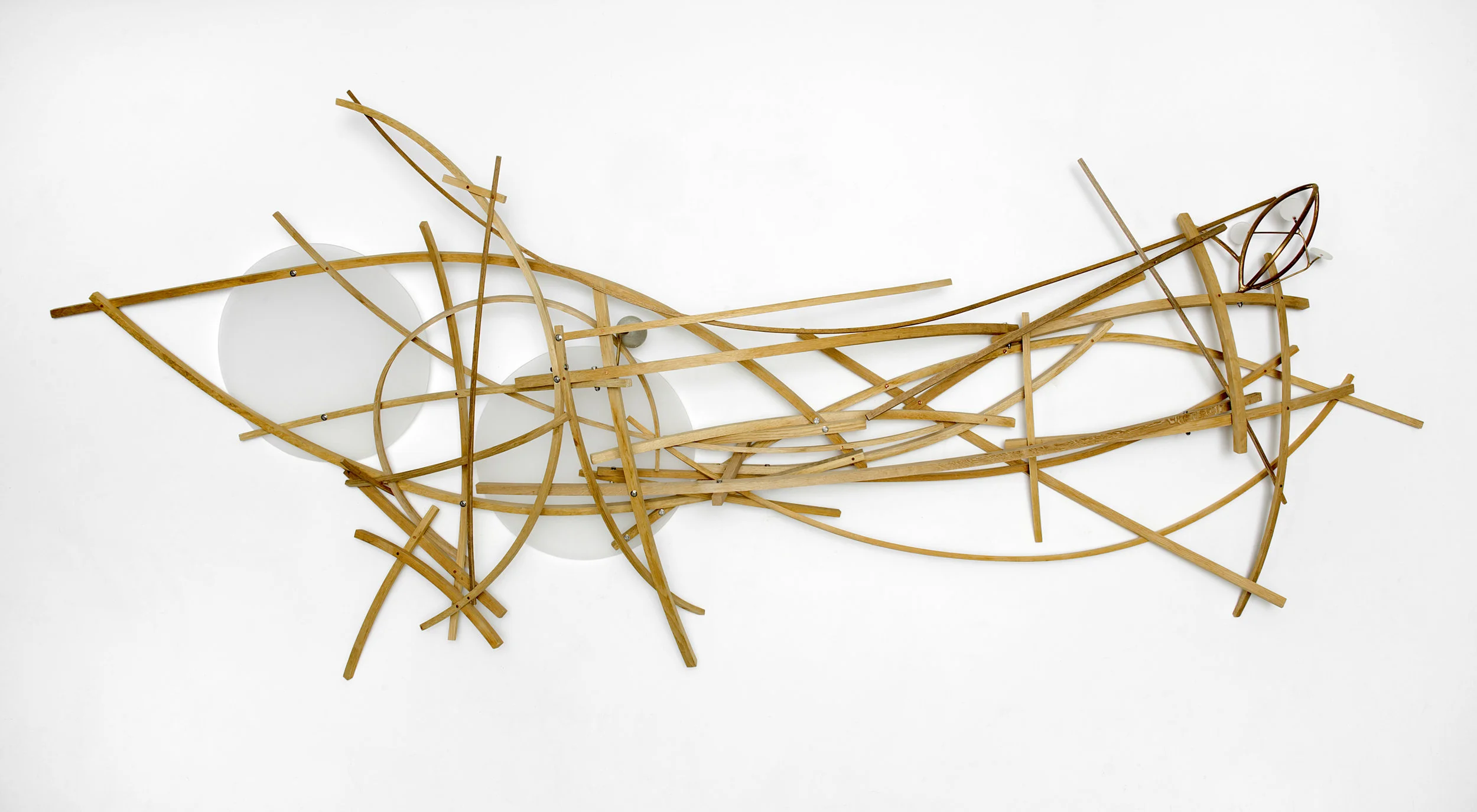 William Brayton’s wall sculptures are a form of architectural inscription in space. Curves, lines, shapes and joins cast shadows, conjure forms, and imply motion through their interaction with the shifting natural and artificial light of the R. W. Kern Center Gallery. Inspired in part by Polynesian nautical stick charts, early navigational aids that mapped ocean swells, the sculptures in this ongoing series take their titles from local wind names drawn from a range of cultures. The materials hold stories of their own: locally-sourced steam bent white oak, with its tight grain and natural rot resistance, has a strong lineage in boatbuilding, furniture and architecture (including the floor of the Kern Center). Elements that appear to be traditional concrete are, in fact, “Braytoncrete”, a lightweight hybrid concrete of Brayton’s devising that uses sawdust as the aggregate. The dialogue at play in these works between sculpture and architecture, natural resources and human ingenuity, tradition and innovation, reflects the underlying ethos of the R.W. Kern Center.